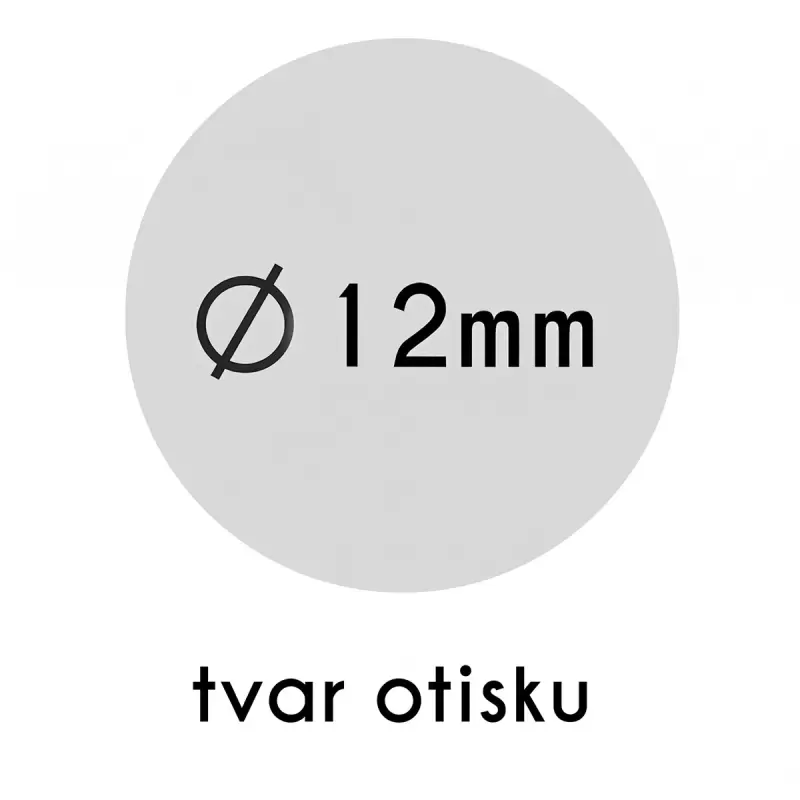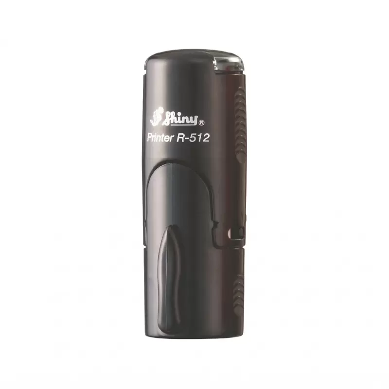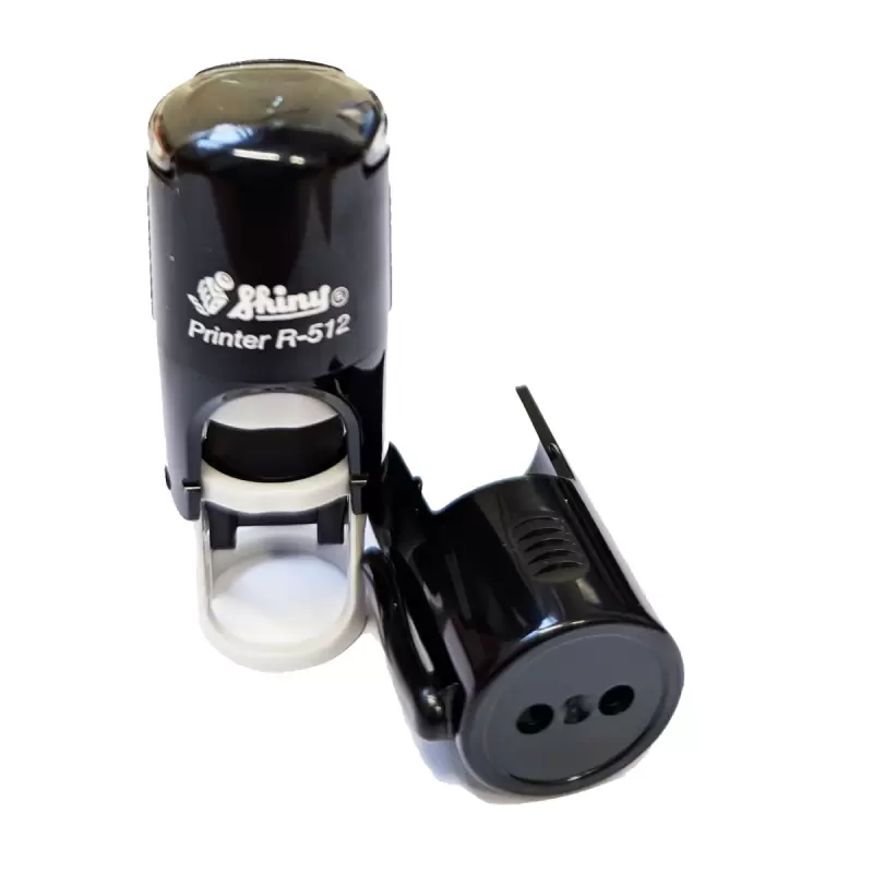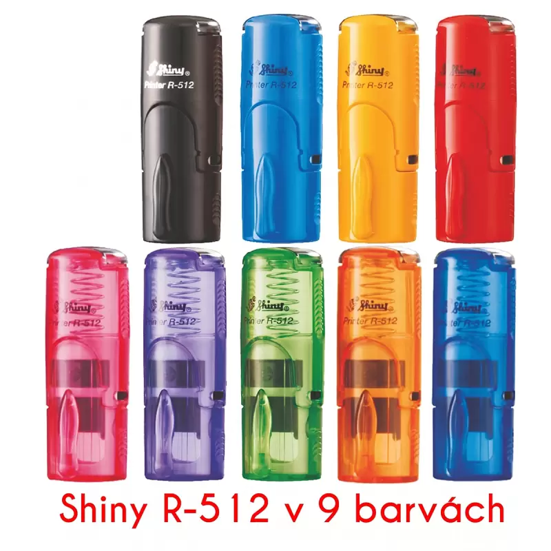 Kvalitní samonamáčecí textové razítko Shiny R-512 řady Printer Line s maximální velikostí kruhového otisku průměr 12mm. Víčko razítka obsahuje dírky na protažení šňůrky k zavěšení na krk.