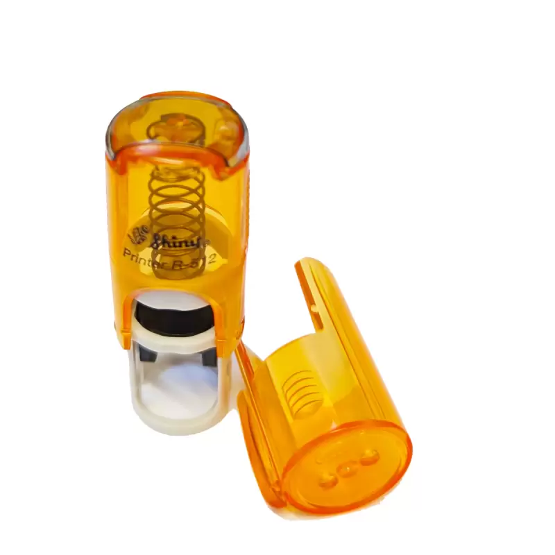 Kvalitní samonamáčecí textové razítko Shiny R-512 řady Printer Line s maximální velikostí kruhového otisku průměr 12mm. Víčko razítka obsahuje dírky na protažení šňůrky k zavěšení na krk.