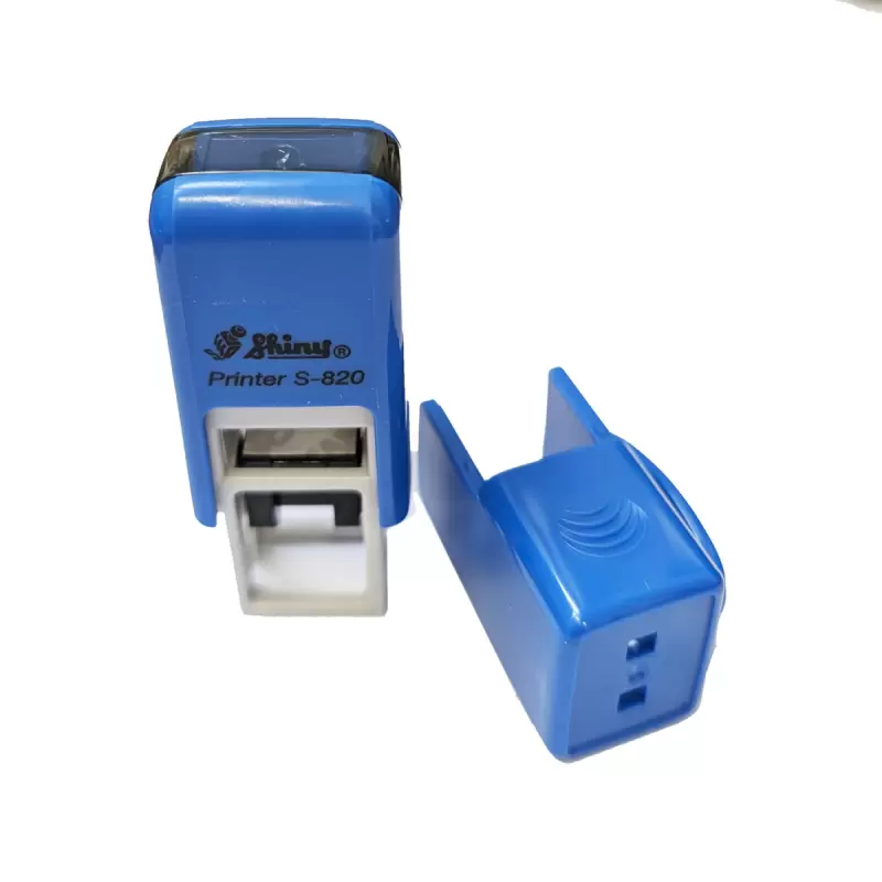 Kvalitní samonamáčecí textové razítko Shiny S-820 řady Printer Line s maximální velikostí otisku 12x6mm. Víčko razítka obsahuje dírky na protažení šňůrky k zavěšení na krk.