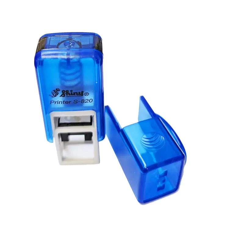 Kvalitní samonamáčecí textové razítko Shiny S-820 řady Printer Line s maximální velikostí otisku 12x6mm. Víčko razítka obsahuje dírky na protažení šňůrky k zavěšení na krk.