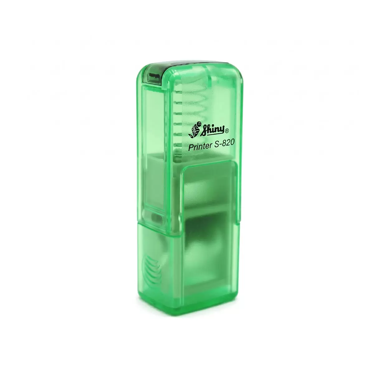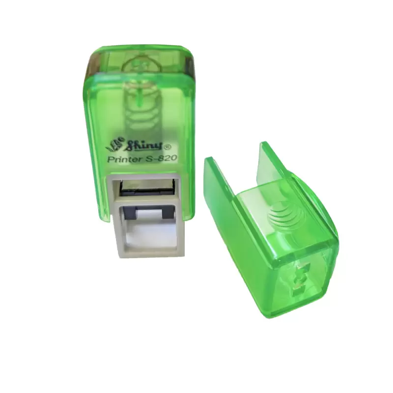 Kvalitní samonamáčecí textové razítko Shiny S-820 řady Printer Line s maximální velikostí otisku 12x6mm. Víčko razítka obsahuje dírky na protažení šňůrky k zavěšení na krk.