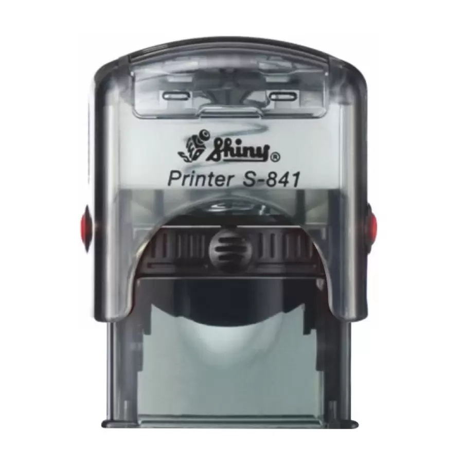 Kvalitní samonamáčecí textové razítko Shiny S-841 řady New Printer Line s maximální velikostí otisku 26x10mm. Transparentní díl strojku umožňuje přesné umístění otisku.